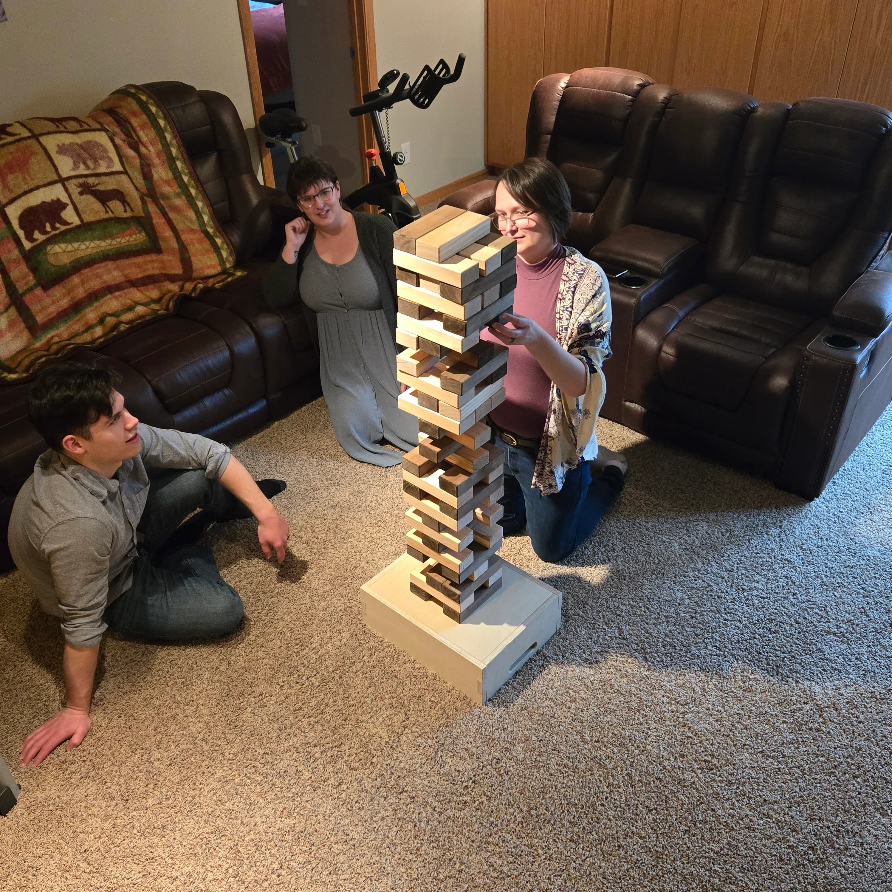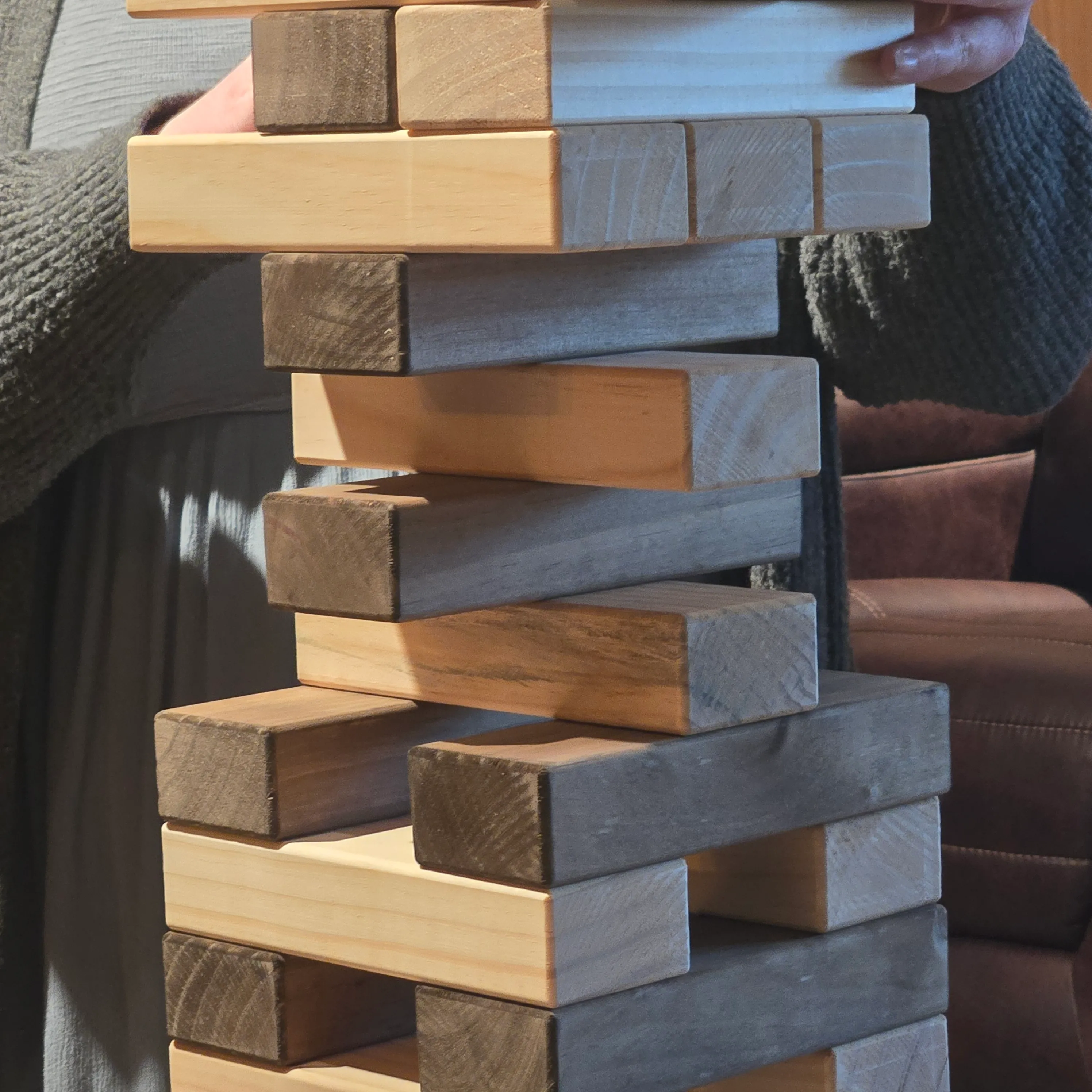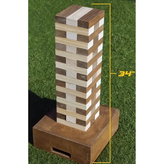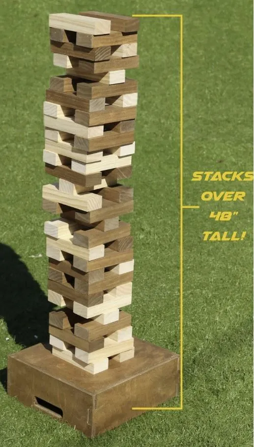 Giant tumble comes with its own platform so you can play on the grass. At start the game measures 34 inches tall and can reach 48 inches tall before it comes crashing down.
